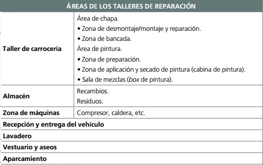 Las operaciones de reparación de vehículos se efectúan en talleres de reparación. Estos talleres se distribuyen en zonas adecuadas a las operaciones por realizar.